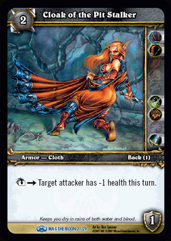 일러스트는 마그테리돈의 둥지에서 얻을 수 있는 장비인 지옥 추적자의 망토이다. 와우TCG의 카드.