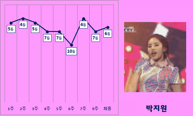 지난주에 2번째로 도전했던 <피노키오>조에 합류했다.[6] 그리고 마지막 순위 발표식에서, 멤버 8명이 확정된 상태에서 이해인과 마지막 순서로 순위 발표 단상에 올랐고 결국 마지막 데뷔멤버로 호명되며 데뷔가 확정되었다!2. 성적