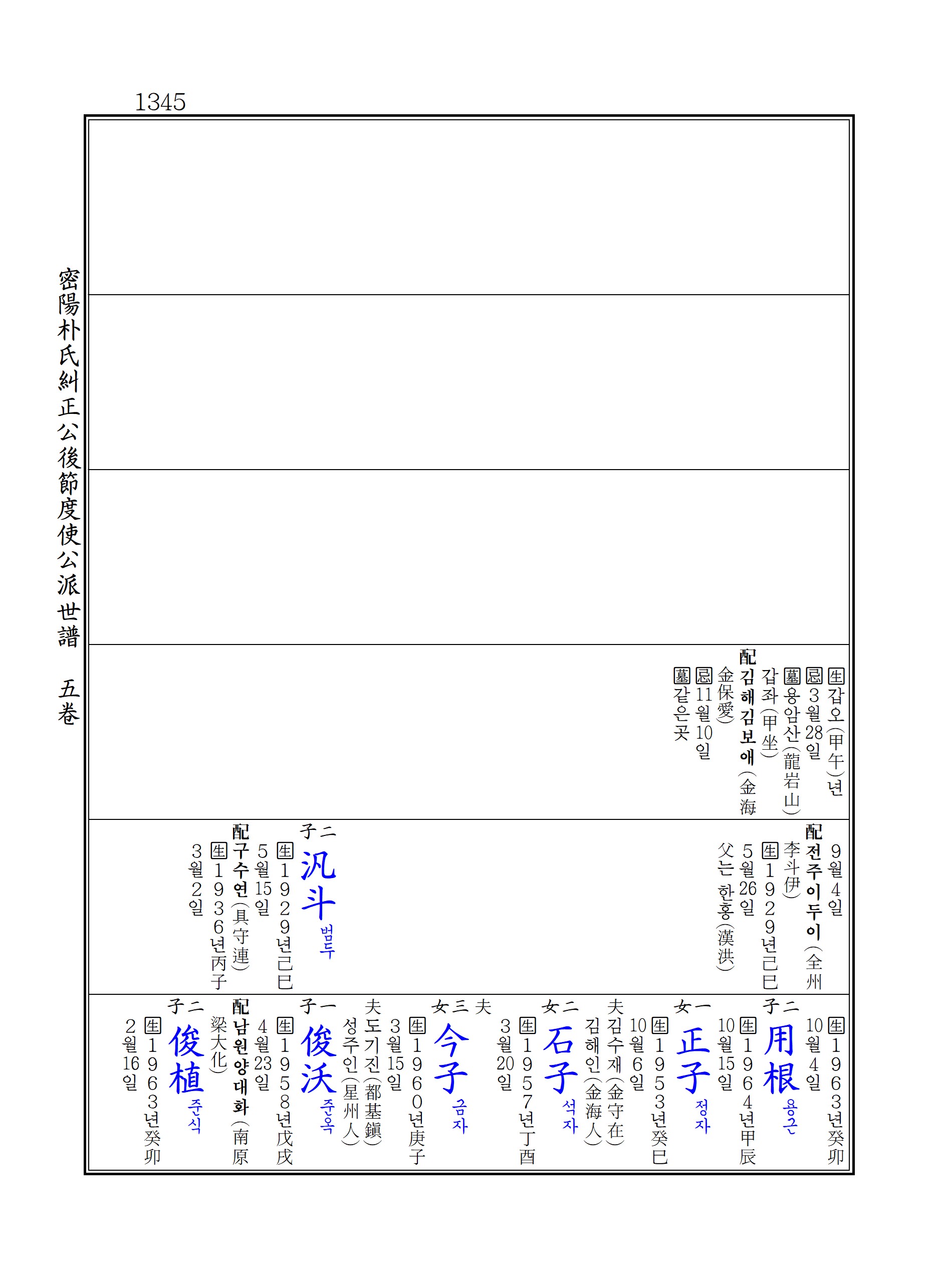 | {{{#!wiki style="margin: 0 -10px -5px; min-height: 26px" {{{#!folding [ 펼치기 · 접기 ] {{{#!wiki style="margin: -6px -1px -11px" | <colbgcolor=#580009,#580009><colcolor=#CFA547,#CFA547> 부모 | 아버지 박정윤(1902 ~ ?) 어머니 한달막(1907 ~ ?) | |