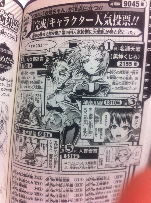 - 제 3회 인기투표에서도 2824표를 차지하며 재차 1위를 달성. 2위인 아쿠네 코키의 1084표의 2배가 넘는 수치로 여전히 압도적인 인기이다. 재밌는건 3위가 젠키치라 남자 주연들 세명이서 반듯하게 정장을 입은 것을 볼 수 있다. 제 2회 인기투표에서 여성 전원 알몸 에이프런이였던 혼파망스러운 모습과는 정반대.