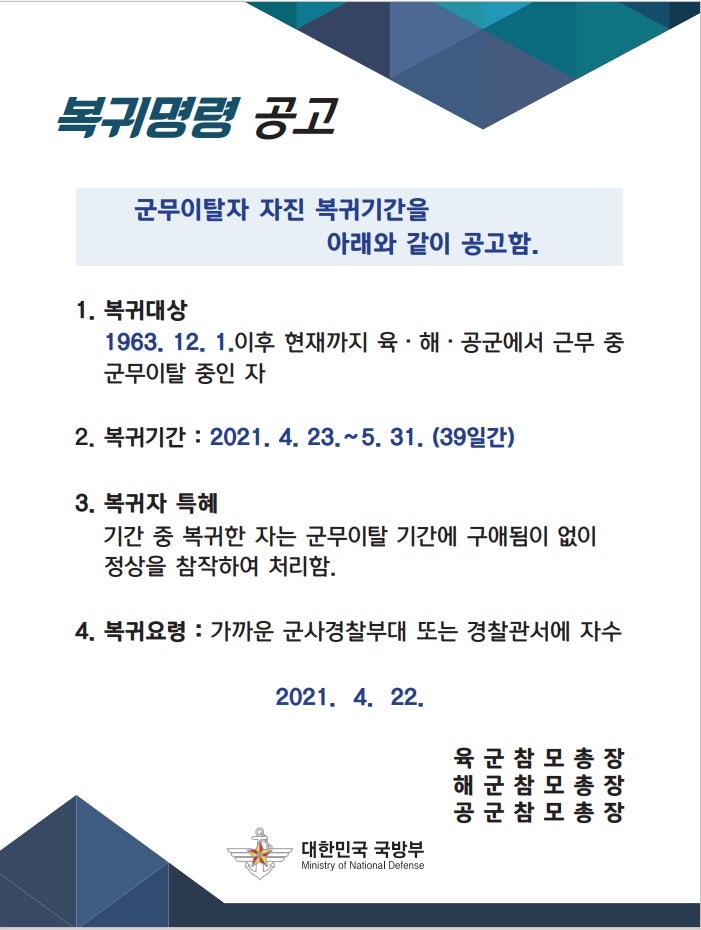군무이탈자 복귀명령[9]을 내리면 인터넷이나 각종 관공서 포스터에 특정 기간까지 가까운 경찰서나 군사경찰에 자수할 것이라는 문구와 동시에 해당 기간 내에 자수하면 탈영했던 기간에 상관없이 정상 참작을 한다는 문구도 들어간다.[10]